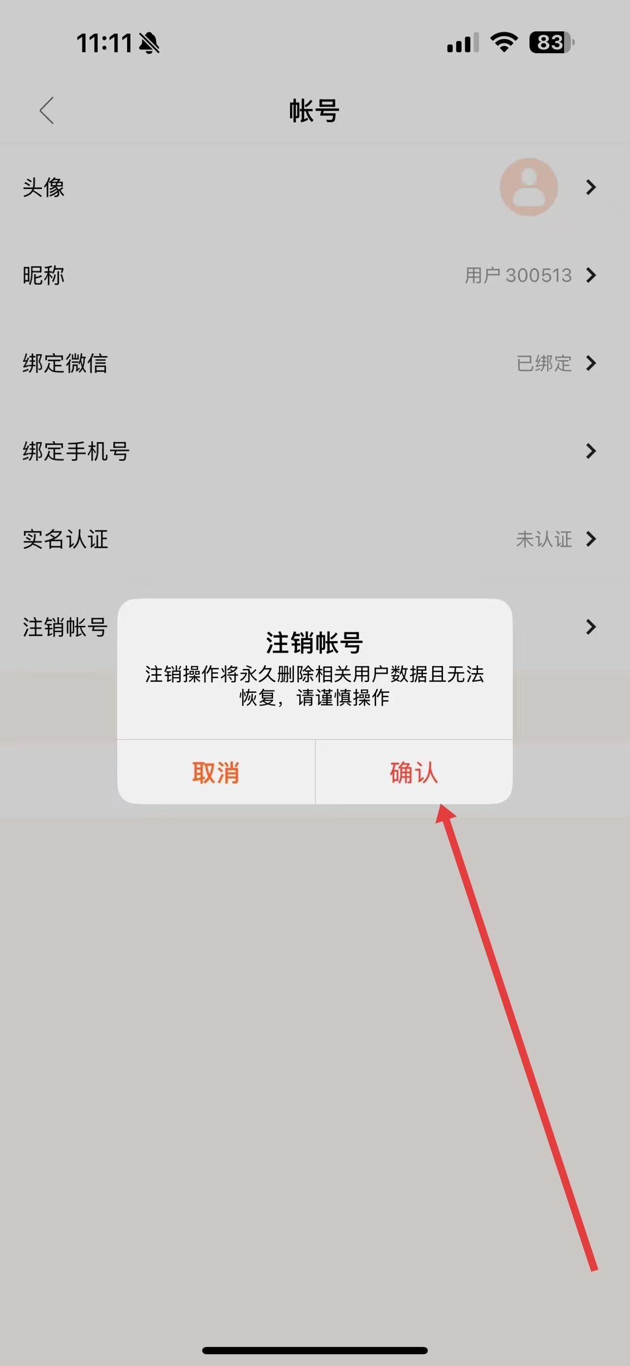 4、当弹出确认提示框后,请认真阅读其中的提示信息,明确注销操作会永久删除相关用户数据且无法恢复,随后点击确认按钮,就能完成账号注销流程。