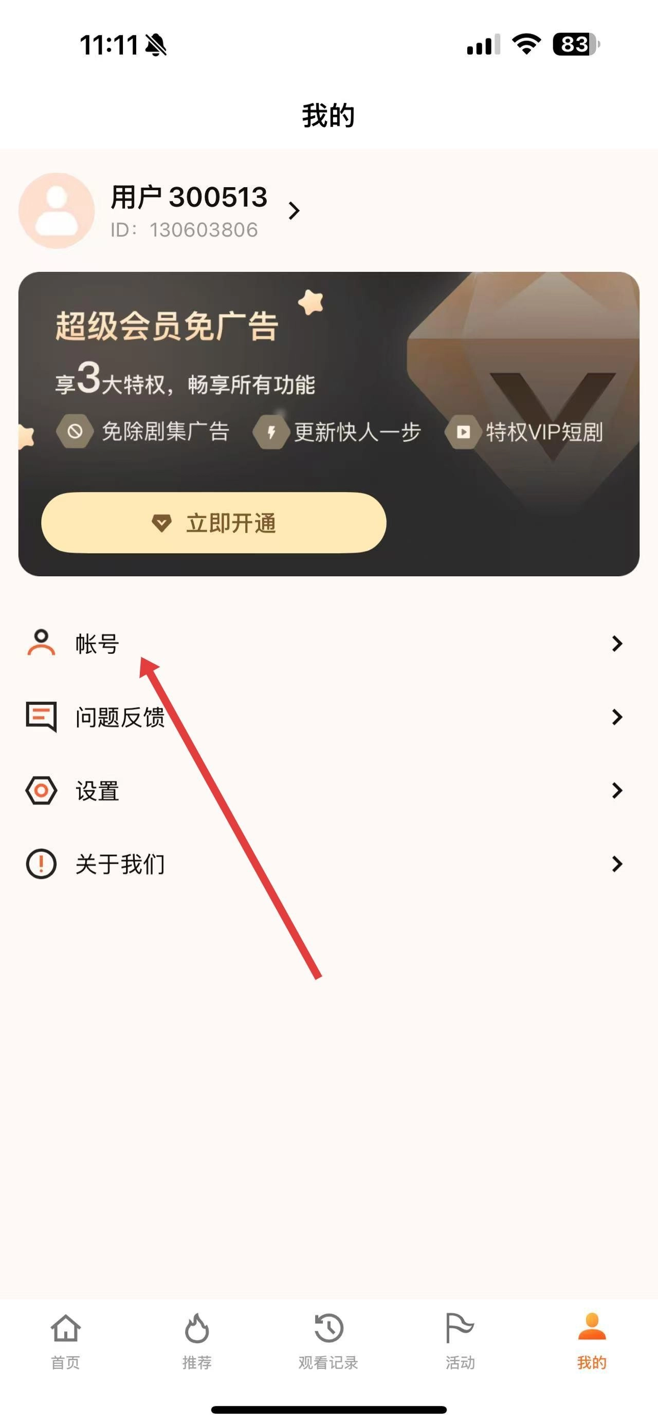 2、在个人页面中,点击帐号选项,进入帐号设置界面。