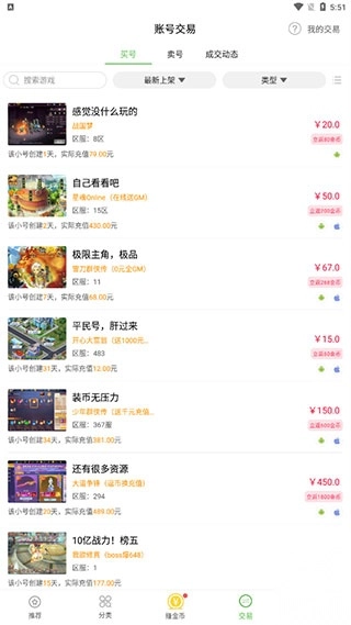 4、点击第三个模块,切换到交易区域,在这个区域里,你既能够出售游戏账号,也可以购买游戏账号。