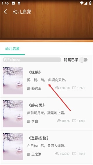 2、在【幼儿启蒙】页面找到《咏鹅》条目,点击进入即可开始该诗的详细学习环节。