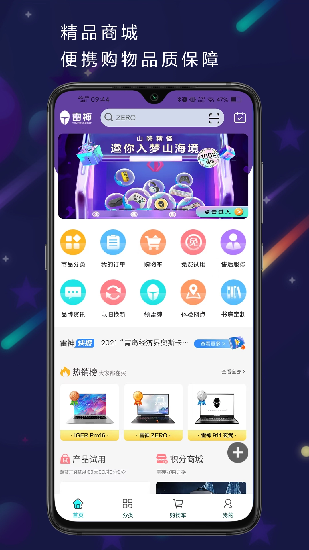 1. 提供雷神笔记本电脑、游戏本、台式机以及VR设备、鼠标、机械键盘、电竞耳机、背包等周边产品的购买及售后服务;
