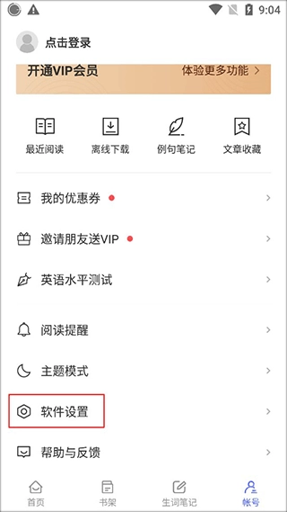 1、首先我们先进入每日英语阅读,在底部的列表中找到【账号】,点击它进入账号界面。