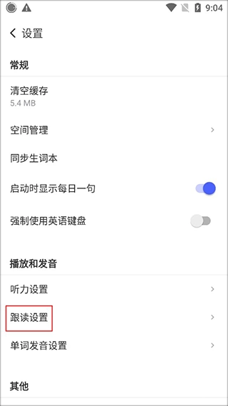 3、在【设置】界面的播放和发音区域找到跟读设置,我们点击它。
