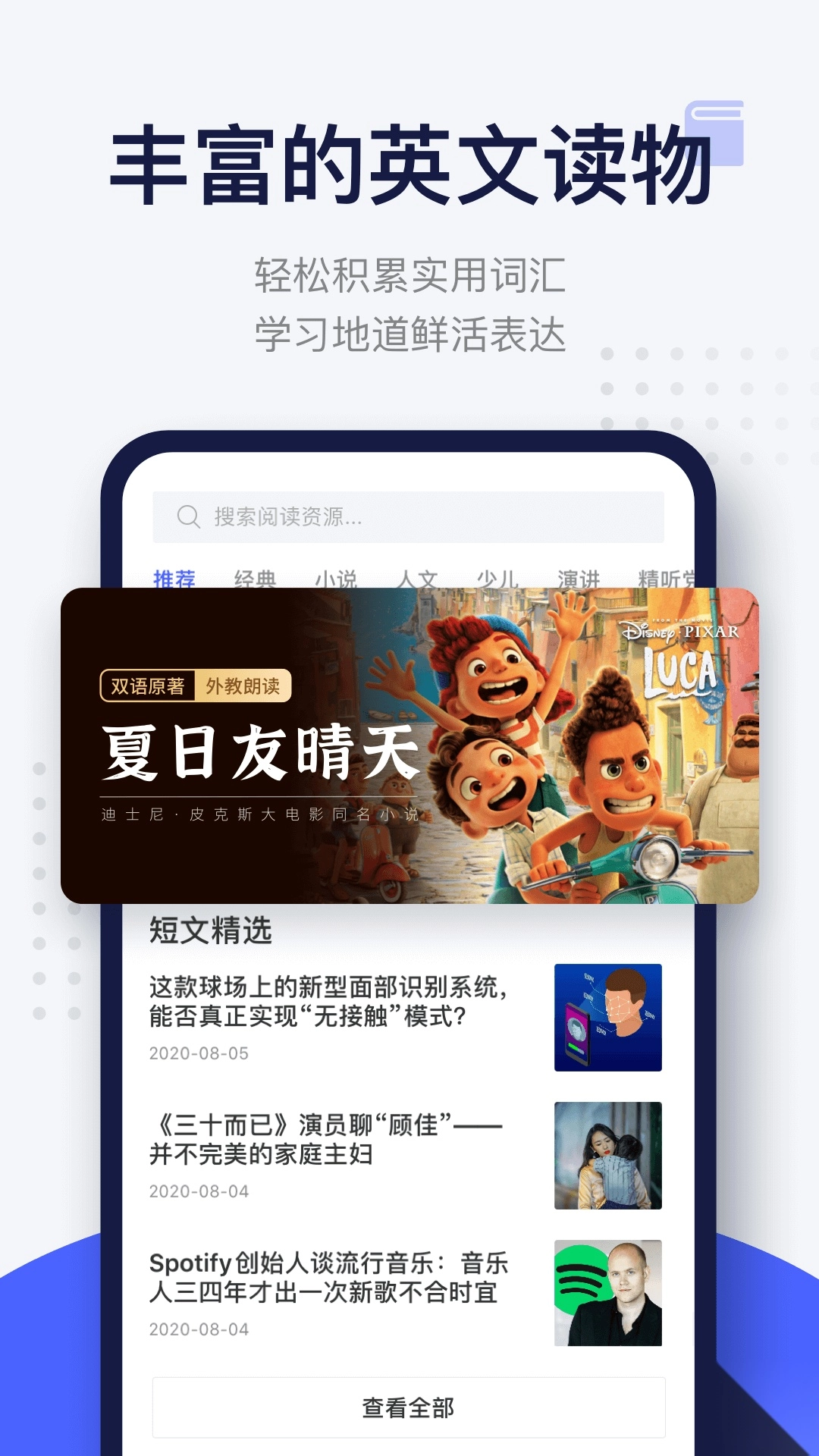 应用会依据用户的英文水平,推送地道的短文与原著内容,并且配备文件导入、单词本学习等功能,以此满足不同用户的学习需求。