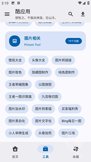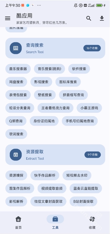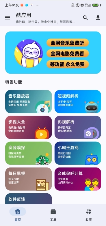 酷应用是一款低调又有内涵的掌上资源搜索聚合神器。在这里,你能找到全网海量的视频、音乐、应用等资源,操作十分简单,只需输入资源名称就能一键搜索。除了资源搜索功能外,酷应用还提供了各类实用小工具供大家免费使用!
