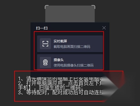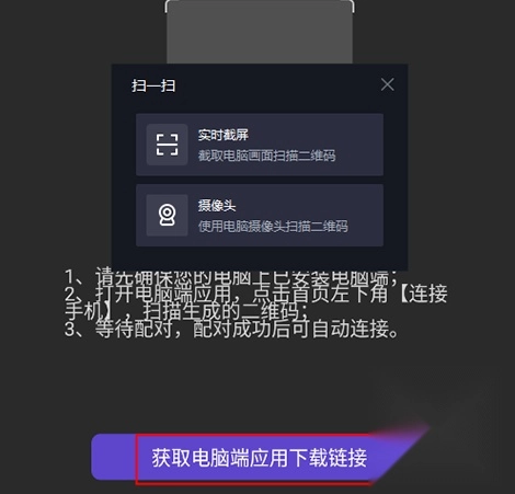 3. 若电脑端已完成安装,可点击电脑首页左下角的“连接手机”按钮,点击后会生成一个用于连接的二维码。