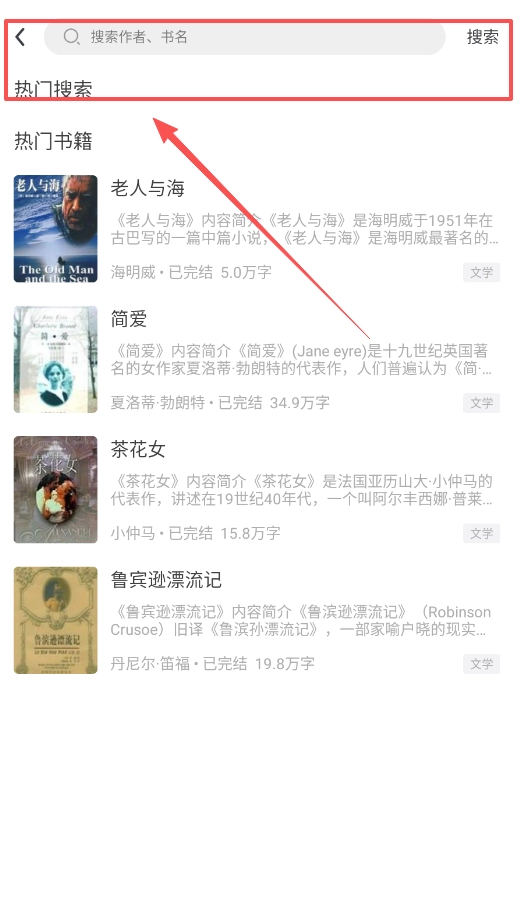 热门搜索中的书籍大多可以免费阅读,像《老人与海》有5万字,《鲁宾逊漂流记》接近20万字,均为完整版且无需额外付费。