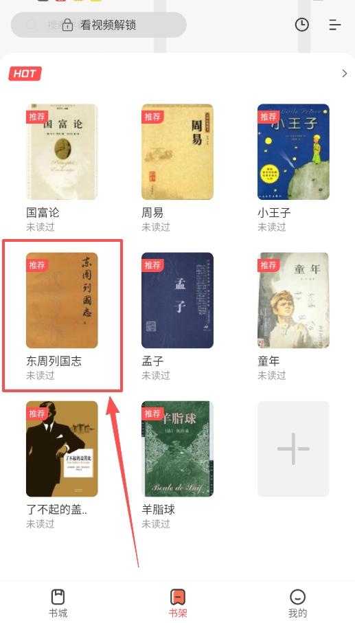 3、当你想阅读《东周列国志》《羊脂球》这类标注着“未读过”的书籍时,选择通过看视频来解锁会比直接付费更实惠,而且每天都有几次免费解锁的机会。