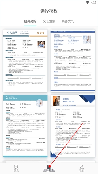 2、填写完信息后,切换至模板选择页面,挑选心仪的模板并点击。随后找到简历阅览区域的分享按钮,就能进行分享或保存到相册。