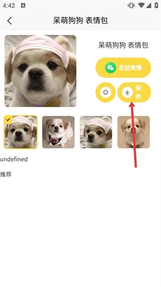 4、进入【呆萌狗狗表情包】详情页,可点击【发送表情】分享,也能点【保存】按钮将该表情包存至本地。