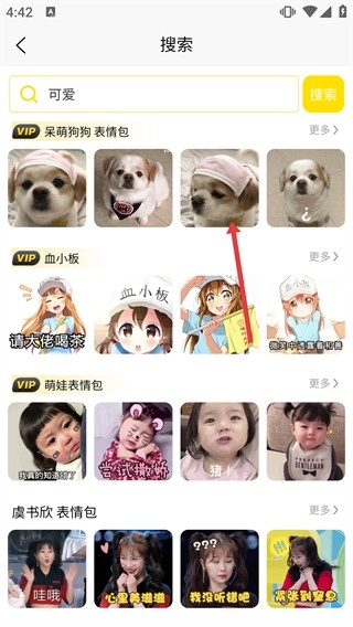 3、在【搜索】页面输入【可爱】等关键词,会展示【呆萌狗狗表情包】【血小板】等分类,点击“更多”查看全部。