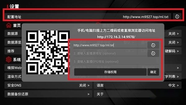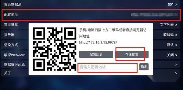 4、接着在TVBox里,依次进入设置、配置地址、存储权限界面,最后通过[clan://localhost/文件名.txt]这个本地地址导入并确认即可。