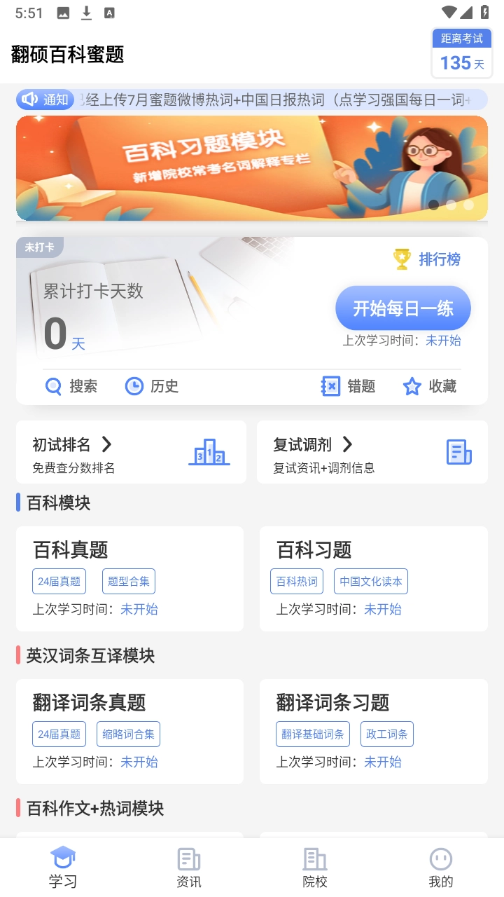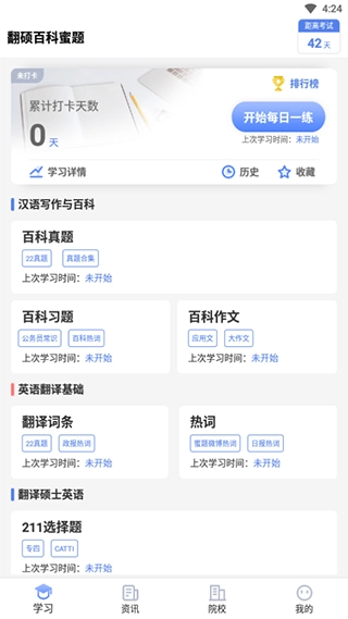 1、学习界面支持每日一练、百科真题、百科习题、百科作文、翻译词条、热词等功能的使用;