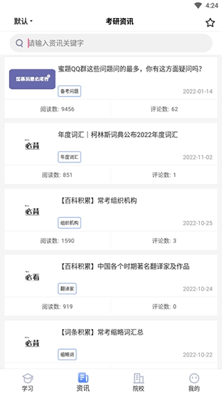 2、咨询界面有柯林斯年度词汇,百科积累,词条积累等学习信息;