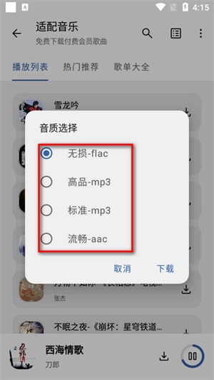 适配音乐是一款功能十分强大的音乐播放软件,它全面整合了全网的音乐资源,使用户能够轻松获取海量歌曲。不管你偏好流行音乐、古典音乐、摇滚乐或是其他各类音乐风格,适配音乐都能满足你的需求。该软件支持多种音质选项,涵盖标准音质、高品质音质以及无损音质。