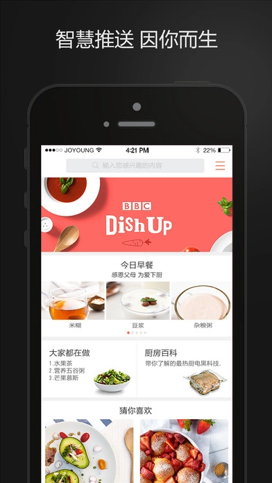 1、爱下厨能够适配九阳集团的全系列产品,助力用户轻松实现健康美味的即时烹饪,让大家可以随时随地、随心所欲地烹制各类美味佳肴;