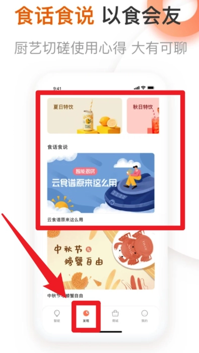 2. 进入底部的“发现”页面后,便能浏览厨电使用技巧、节气饮食推荐等图文内容。
