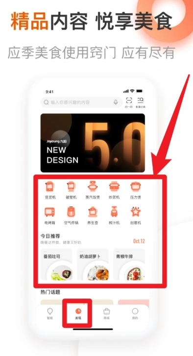 3. 点击“发现”页面里的各类厨电图标,就能查看相应设备的特色食谱和使用建议。