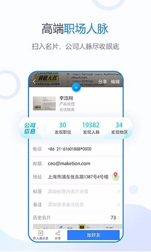 3、3【人脉管理】构建人脉网络,实现实时拓展;支持与无忧精英网进行人脉匹配,助力用户迅速拓展人脉资源;同时可整合管理线上线下的所有联系人脉。
