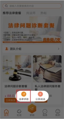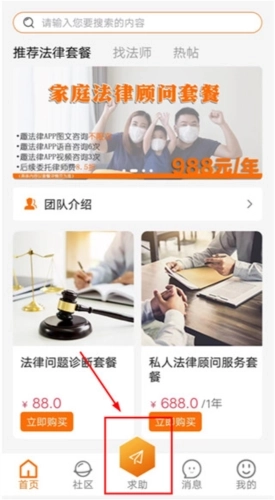 1、好趣法律后,登陆平台,点击下方【求助】。