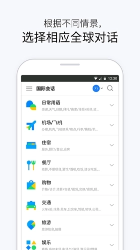 基本用语、机场/飞机上、住宿等,可按情况选择需要的译文。