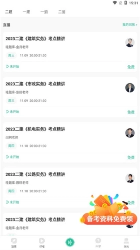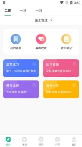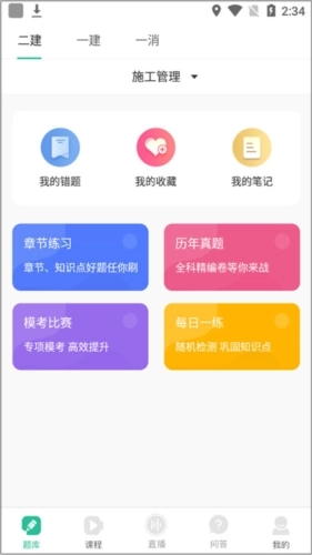 1、进入哇题库后,能看到一建、二建、一消的考试资料,用户可根据自身需求选择学习内容,平台内包含各类练习题及模考比赛供大家使用。