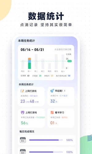多维度呈现习惯数据,能让你快速知晓每个目标的坚持天数与完成情况,见证每日进步,收获丰硕成就。