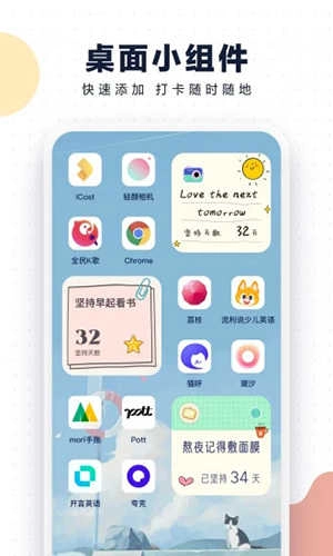 一键添加桌面小组件,打卡随时随地,让坚持变得很简单,离成功更近一步。
