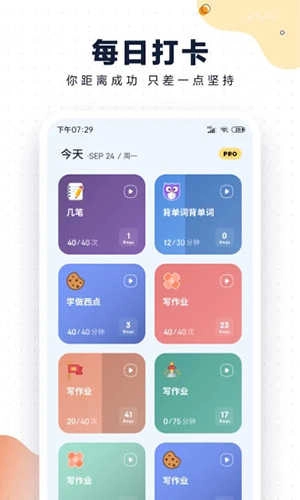 制定专属计划打卡,规划每天/周/月需要打卡次数或时长,按时完成设定目标,培养高效时间管理,让自律成为你的习惯。
