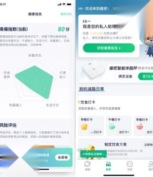人均减脂量超10斤,累计助力用户总减脂达420万斤;提供全流程减脂方案跟踪服务,涵盖10项身体数据,实现实时精准监控与可视化分析管理;拥有7万余名专业体脂管理师,全程在线一对一指导,量身定制专属个人减脂方案。