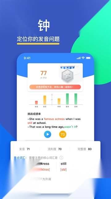3、借助音素级别的声纹分析技术,能够精准识别发音上的不足(比如方言口音、连读错误等),并给出逐句的评分以及针对性的矫正建议。