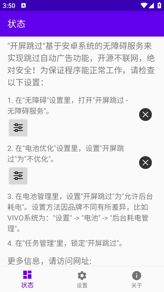 4、在关于界面,可以了解开屏跳过功能,以及访问网站。