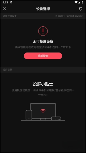 3、接着耐心等待手机搜索到电视信号,待信号出现后,点击选择对应信号即可开始投屏,需特别注意,电视和手机务必连接在同一wifi网络环境下。