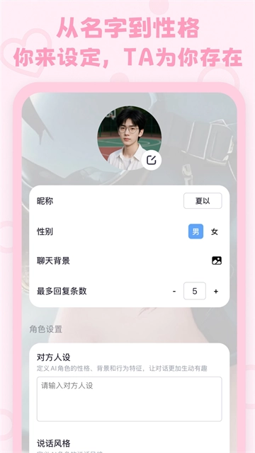 1、具备高度自由的角色自定义能力,支持对角色的外貌和背景进行设定,并且能够随时切换不同关系定位的角色。