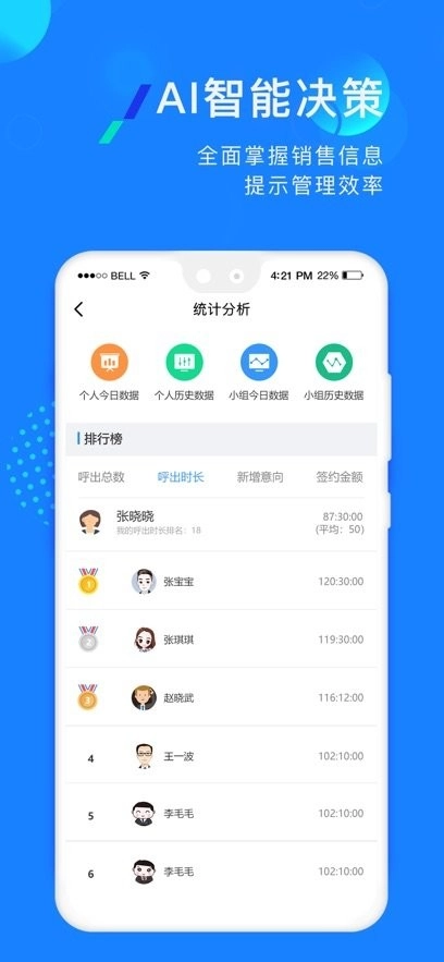 可以随时随地查看排行榜,以及个人和小组的今日与历史数据分析,从而全方位掌握企业的经营状况。