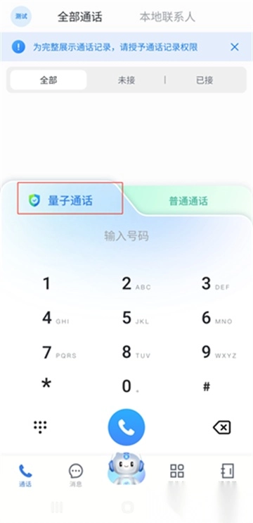 3选择“量子通话”选项,接着输入对方的号码,之后点击拨号按钮,就能发起加密通话了。
