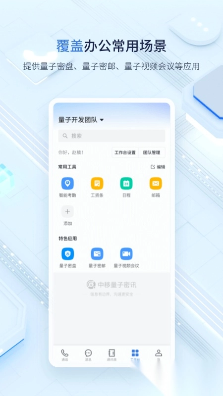 中移量子密讯是中移互联网有限公司精心打造的一款专注于加密通信的即时办公软件。它集成了通话、消息、通讯录、工作台和个人中心等多个功能板块,能够全面满足安全办公沟通的各类需求,致力于为用户提供更高级别的通信防护,让工作交流在安全可信的环境中开展。