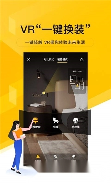 VR看房还有一个独特的优势,那就是二手房的“一键换装”功能。用户在了解二手房的实际情况后,能够一键切换各种装修风格,提前体验家的不同模样。