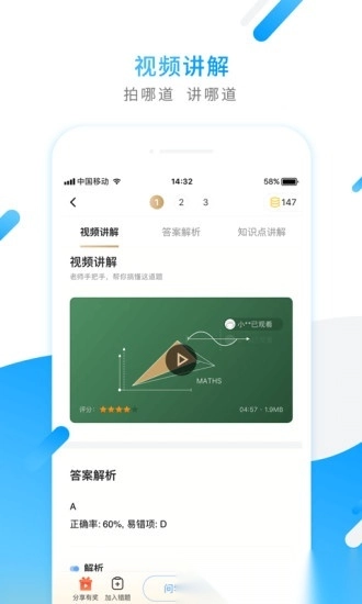 由经验丰富的教师通过真人视频进行解析,遇到不懂的内容只需拍摄对应的部分,就能观看老师的讲解视频。