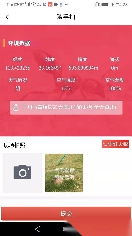 2、发现红火蚁巢穴时,用户可立即拍照并进行上传登记;