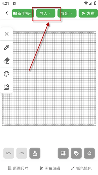 2、若希望快速生成模板,可点击“导入”上传图片,软件会自动将其转换为拼豆图纸;若倾向手动设计,则点击“画布编辑”,设置好画布尺寸后即可开始创作。