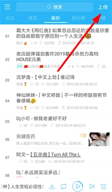 1、现在打开“dj音乐库”的主页后,大家需要先点击右上角的上传按钮(如下所示),此时软件会自动搜索手机本地的音频文件。