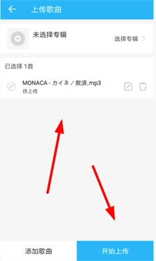 3、这样操作之后,我们只需在上传歌曲页面的右下角点击“开始上传”按钮,就能把手机本地存储的歌曲上传至“DJ音乐库”中了。
