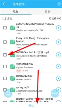 2、成功勾选好想要上传的音乐后,再点击页面底部的“确认”按钮,就可以尝试发布该作品了。