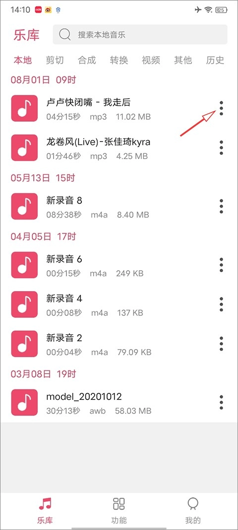 1、打开并进入乐库,先把你要截取的音乐下载下来,这里会自动导入你的本地音乐,点击该音乐右侧的三个点。