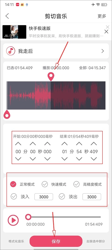 3、用手拖动音频区域的切割线,两条切割线之间的部分即为你要截取的音频内容。你也可以直接设置截取音乐的开始时间和结束时间,下方还能选择模式。如果想添加其他特效,点击右上角的“更多”按钮自行探索即可。