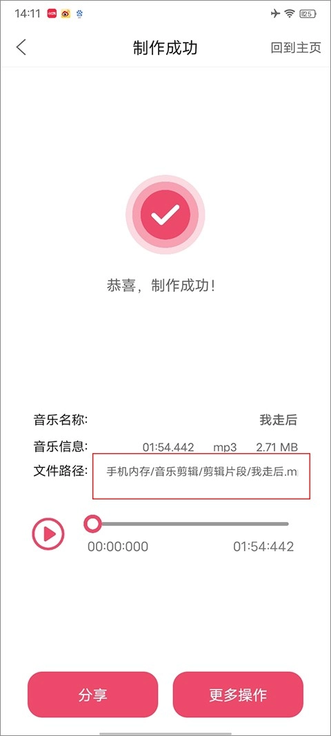 5、下面呈现的是制作完成的界面,这里会显示文件的保存路径,以上步骤就是使用这款软件剪辑音乐的教程啦。