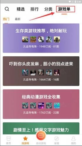 3、点击“单”可以查看软件为我们准备好的合集内容,涵盖生存类、恐怖类、动漫类、文字类等多种类型,感兴趣的玩家可点进去查看。