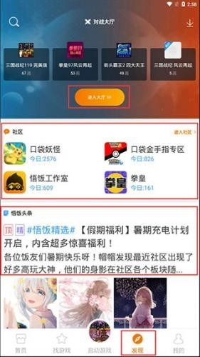 6、点击底部菜单栏的“发现”按钮,就能进入综合页面。该页面自上而下依次设有对战大厅入口、玩家社区和资讯头条板块,玩家可通过这些功能开启联机对战、进行社区交友以及浏览各类资讯。