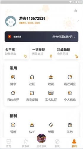 7、点击底部菜单栏的“我的”,就能查看玩家账号相关信息,软件设置也集中在这里,玩家可进行金手指与一键技能的设置,还能查看收藏内容和浏览记录。